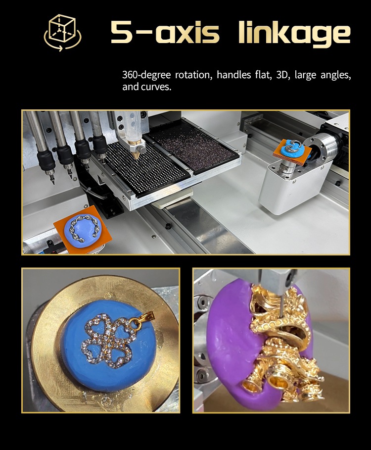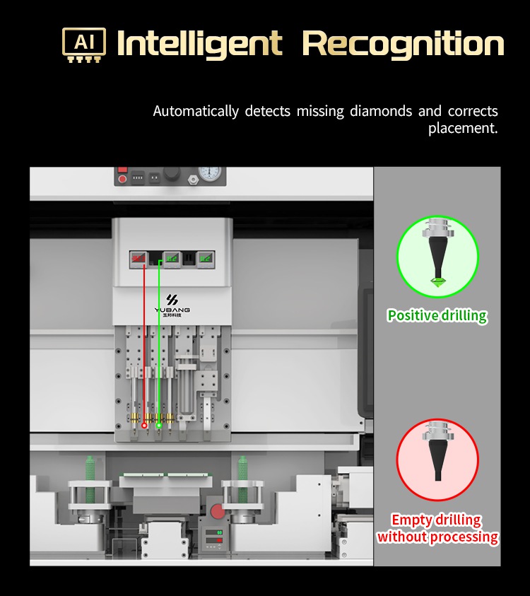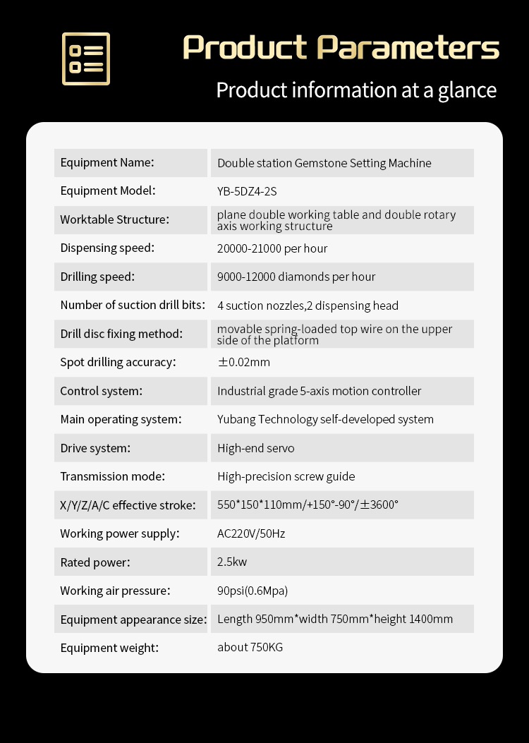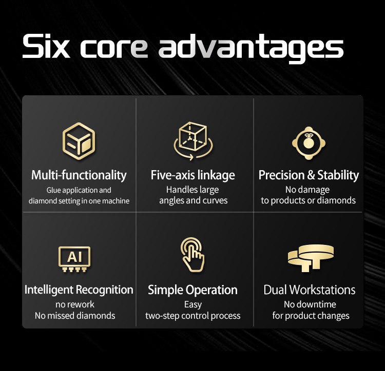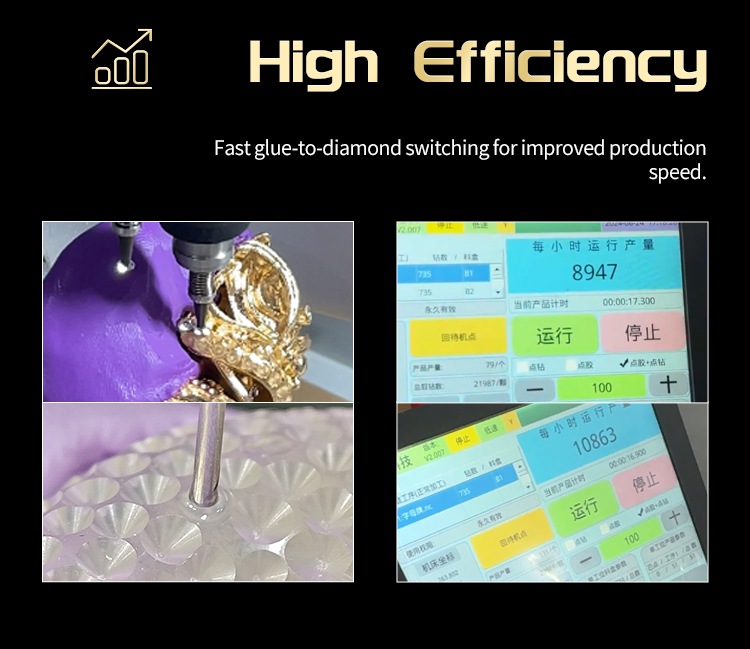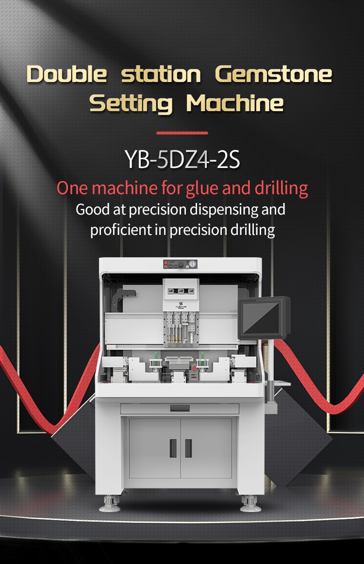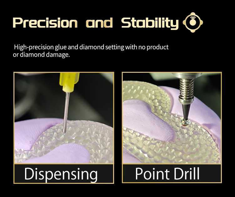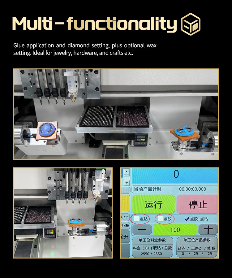 An important jewelry processing equipment,The machine combines glue application and diamond setting in one, featuring a dual-workstation design that offers the efficiency of two machines in one. It supports continuous operation, allowing one person to easily handle diamond setting and inventory checks.