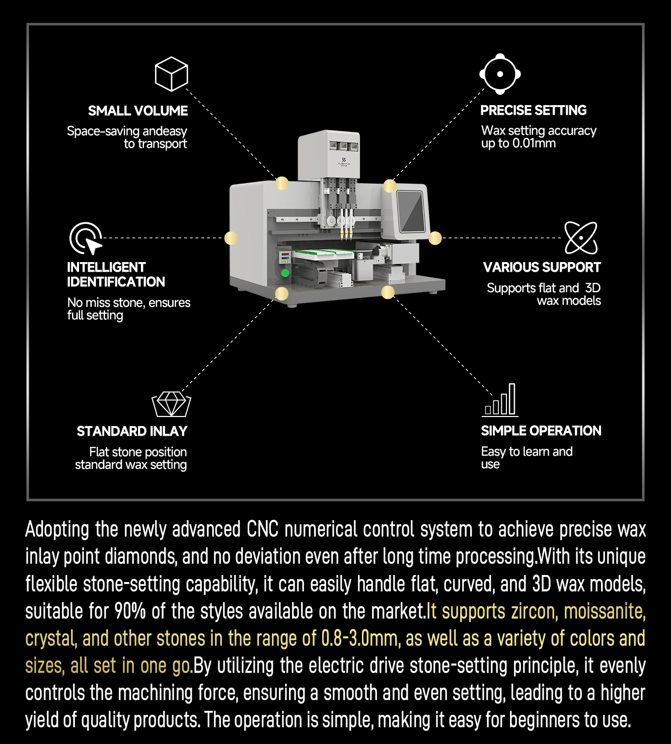 In traditional jewelry making, stone setting on wax molds is time-consuming and skill-dependent. CNC wax setting machines solve these challenges with automation.