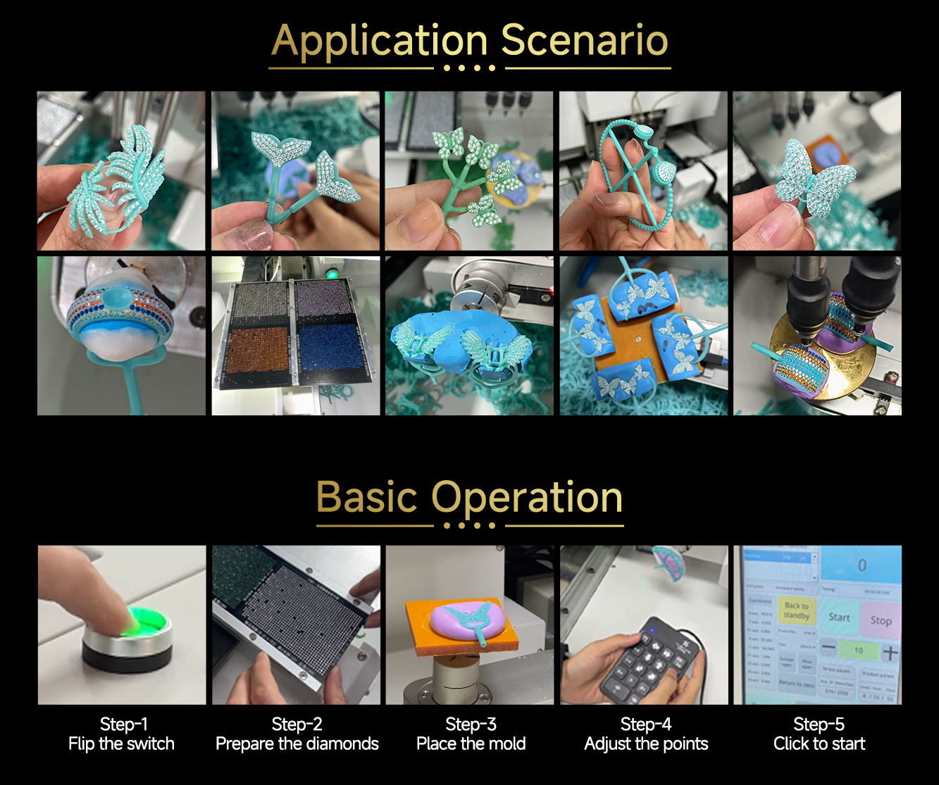The YUBANG YB-MN-5DZ3Z model is an ultra-compact desktop machine that automates the diamond and gem-setting process on wax molds. Built for precision and versatility, it combines five-axis CNC linkage, intelligent recognition, and electric-driven stone placement, achieving a professional finish suitable for 90% of jewelry styles in the market.