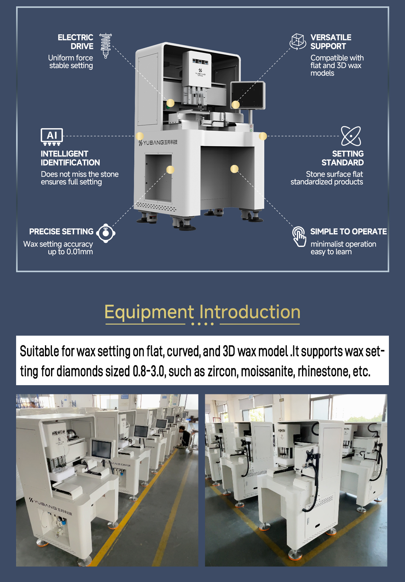 The YUBANG YB-5DZ3-S model is an single station machine that automates the zircon diamond and gemstone setting process on wax molds. Engineered for precision and speed, it combines 5-axis linkage, intelligent recognition, and electric-driven stone placement, achieving a professional finish suitable for 90% of jewelry styles in the market.